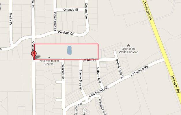 The First Mennonite Church on the near-northwest side of Indianapolis has engaged in several initiatives that have dramatically altered the congregation’s stewardship of its large property, as well as its physical appearance. The ten-acre parcel rests in the almost exclusively residential Crooked Creek neighborhood, generally large-lot and suburban in appearance and character, yet conveniently only about four miles from the city’s downtown, as seen in the Google map below: