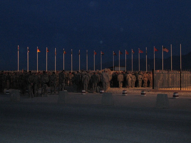 It seems to be common practice to decorate the dining halls in the larger bases with national flags. But the flags preside over clearly bounded space here; any assertion of territoriality simply adds a dimension to the message already communicated by four walls. The display of flags indoors does not convey the potentially contentious air of imperial entitlement that it has the potential to suggest when outdoors; the flags address an enclosed space and not the open air, or the land itself. Perhaps it’s just me, but flags also lose expressive impact when they are limp and static; the fluttering of a flag from wind, however mild that wind may be, projects authority that it is hard for a motionless flag to muster. So while the exterior display of flags seems particularly sensitive to the fact that these nations collectively occupy a land with which they are waging war against a certain faction, all the rules fall by the wayside when flags hang indoors. No one seems particularly sensitive of who owns what. The PAX terminal at Camp Marmal is an excellent example: