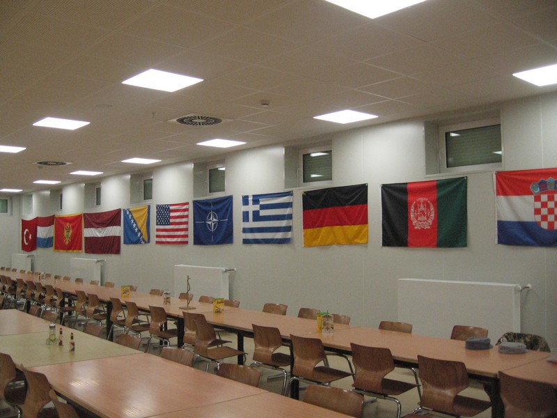 From left to right, the picture shows Norway again (same flag as the previous photo), Sweden, Finland, Belgium, Montenegro, Slovakia, Latvia, and part of Turkey. The positioning, size, and even the choice of nationalities here seem to be based more on expediency than any sort of conceived arrangement. The spacing between them seems inconsistent, the size does not fit with either a hierarchy or an egalitarian coalition, and while Turkey and Slovakia may be part of the coalition, they have yet to show any presence at Camp Marmal, while other nations clearly berthed here have had their flags omitted. Anyone plunked into this facility while blindfolded would draw the conclusion, upon removing the blindfold, that it is a German-run building. Provided that he or she knows the German flag, the enormous mural makes it obvious. But the participation of these other nations and how they fit into the system on this base is completely undefined. The flags help add color to an otherwise sparse terminal; otherwise they might as well be garland.